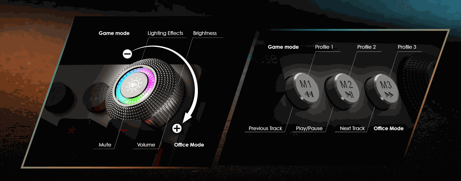 Alternez facilement entre le mode Jeu et le mode Bureau en appuyant quelques secondes sur le bouton dédié. Le panneau de contrôle intuitif vous permettra d’ajuster les effets de lumière, la luminosité et le volume audio. Les touches multimédia dédiées vous offrent un accès rapide aux profils multimédia ou personnalisés, ce qui vous assure une productivité ou une expérience de jeu ininterrompues.
