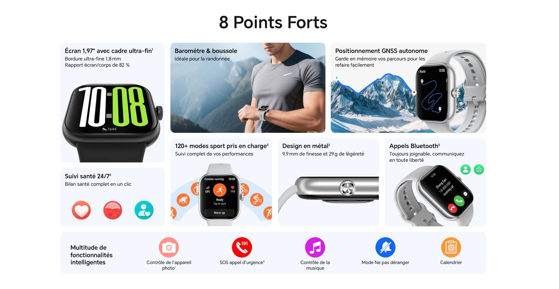 Une montre connectée pensée pour simplifier votre quotidien et booster votre style. Avec son écran de 1,97 pouces au cadre ultra-fin et son design en métal élégant, elle allie esthétique et robustesse. Suivez votre santé 24h/24 et 7j/7, mesurez vos performances grâce à plus de 120 modes sportifs, et profitez d’un positionnement GNSS autonome précis, ainsi que d’outils pratiques comme le baromètre et la boussole. Recevez vos appels directement via Bluetooth et explorez une multitude de fonctionnalités intelligentes pour rester connecté, actif et organisé en toutes circonstances.